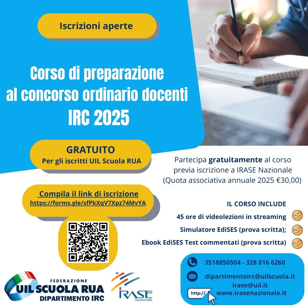 Si prega di prendere visione dei documenti in allegato. Allegati LOCANDINA CORSO CONCORSO ORDINARIO IRC jpeg - 159 kb PRESENTAZIONE CORSO FORMAZIONE UIL IRC 2025 pdf - 1041 kb