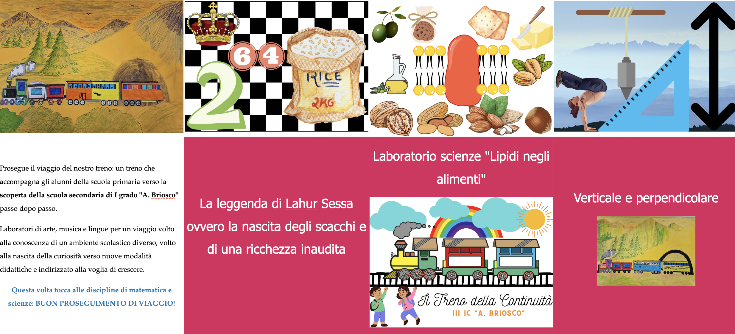 | Il viaggio è iniziato il 21 novembre ed è proseguito il 28. In quei due giorni il nostro treno, simbolo del viaggio dalla scuola primaria a quella secondaria, ha effettuato la sua “prima fermata”. I nostri ragazzi delle classi prime hanno incontrato i bambini delle classi quinte primaria del nostro Istituto. Cosa hanno fatto? Hanno realizzato insieme “il treno”. I nostri ragazzi hanno fatto gli onori di casa, mostrando la scuola, colorando insieme i vagoni del treno e giocando in palestra. Gioia e allegria si contendevano gli sguardi di tutti i partecipanti. Intanto, adesso, ci prepariamo per la prossima fermata. | |||
