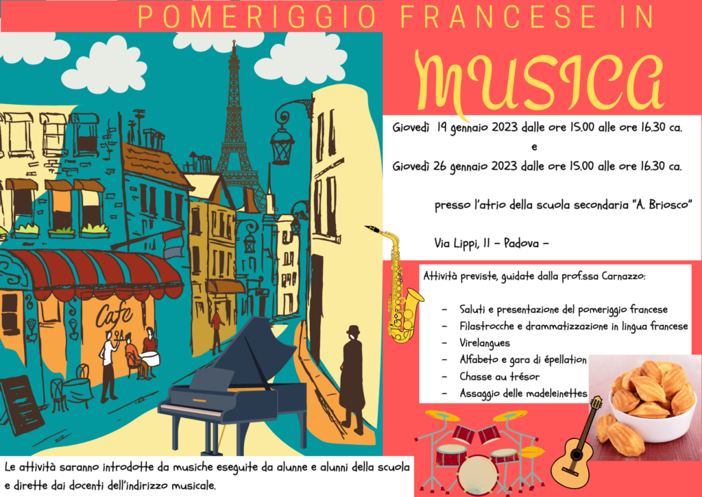 La scuola “A. BRIOSCO” è lieta di invitare gli alunni delle classi quinte primarie ai POMERIGGI FRANCESI IN MUSICA LINK ALLA CIRCOLARE INFORMATIVA
